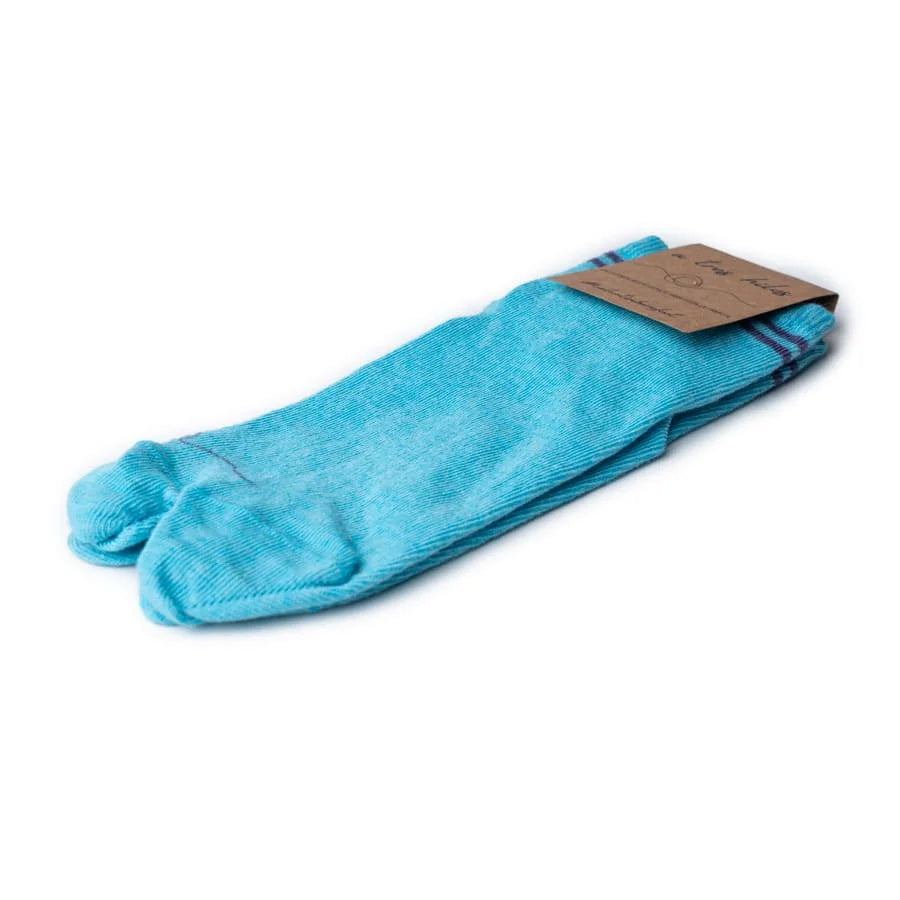 El tono azul cielo, suave y luminoso, transmite frescura y calma. Su puntera tabi, que separa el dedo gordo, facilita un movimiento más natural y flexible, mejorando el equilibrio, la estabilidad y la conexión con el suelo.